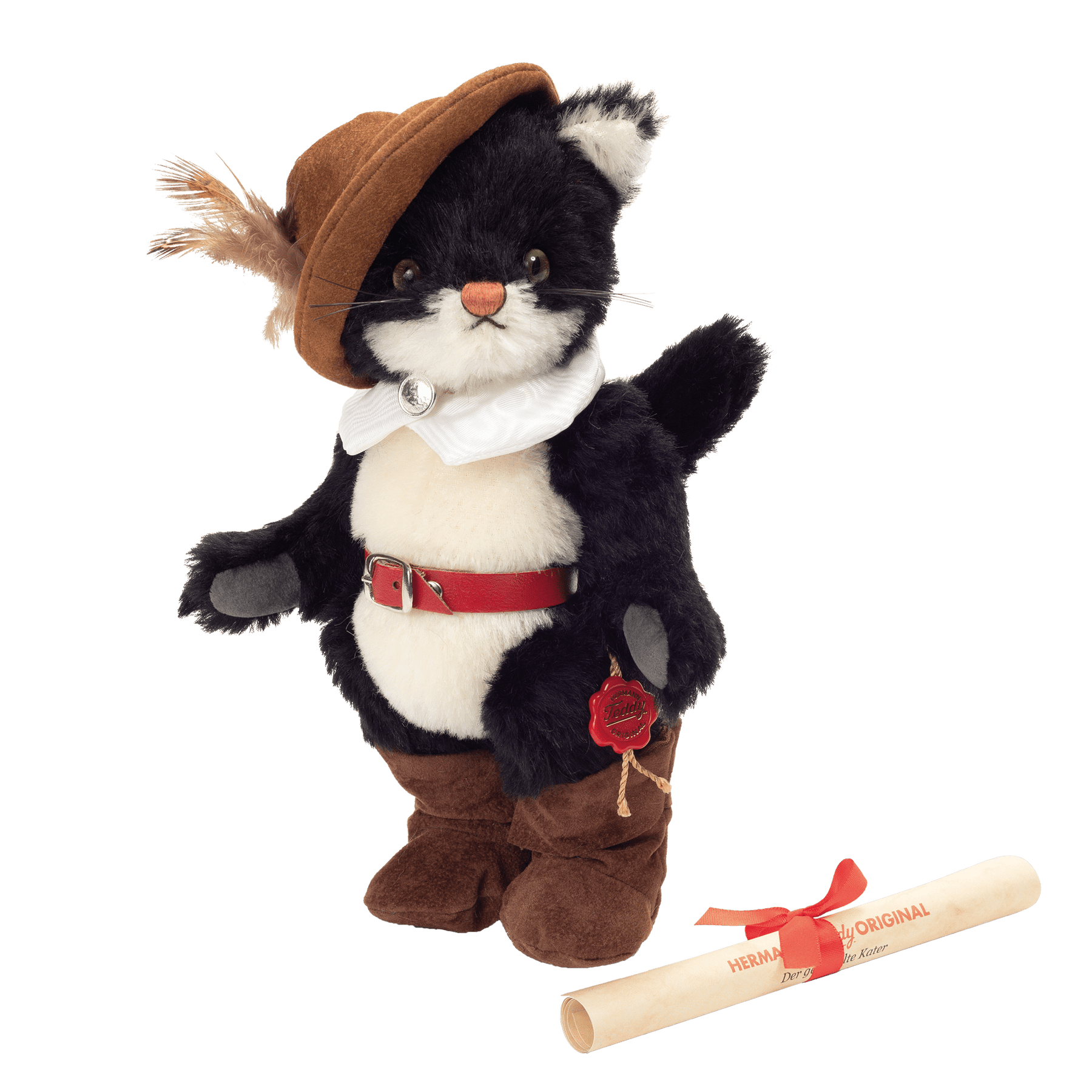 Due to its great popularity, Puss in Boots has been an integral part of the fairy tale bear series from the Teddy-Hermann Bärenmanufaktur for years. This extremely dashing Puss in Boots in the black and white plush version is equipped with typical attributes such as the hat with feathers, a belt and, of course, the boots. All accessories were designed and manufactured in Teddy-Hermann's bear studio. Limited to 200 pieces worldwide. Not a toy! Not suitable for children!  Collectible.