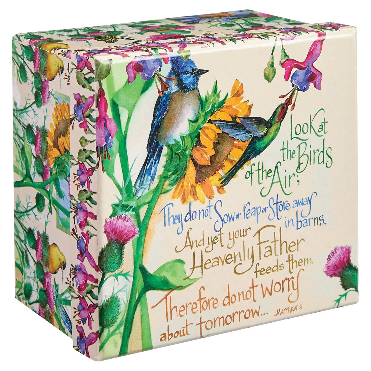 This ceramic scripture mug features floral and botanical artistry by Michelle Palmer of watercolor bluejay, yellow finch, and red throat hummingbird, butterfly, bee, sunflower, daisy, and more. Words of inspiration are featured on the outside of the cup and matching gift-ready art box. This lovely boxed mug will make a beautiful gift for someone you love.