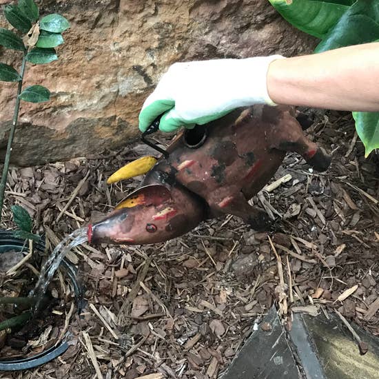 Whimisical metal art piggy does double duty as a decoration and waters your plants (with your help of course!)