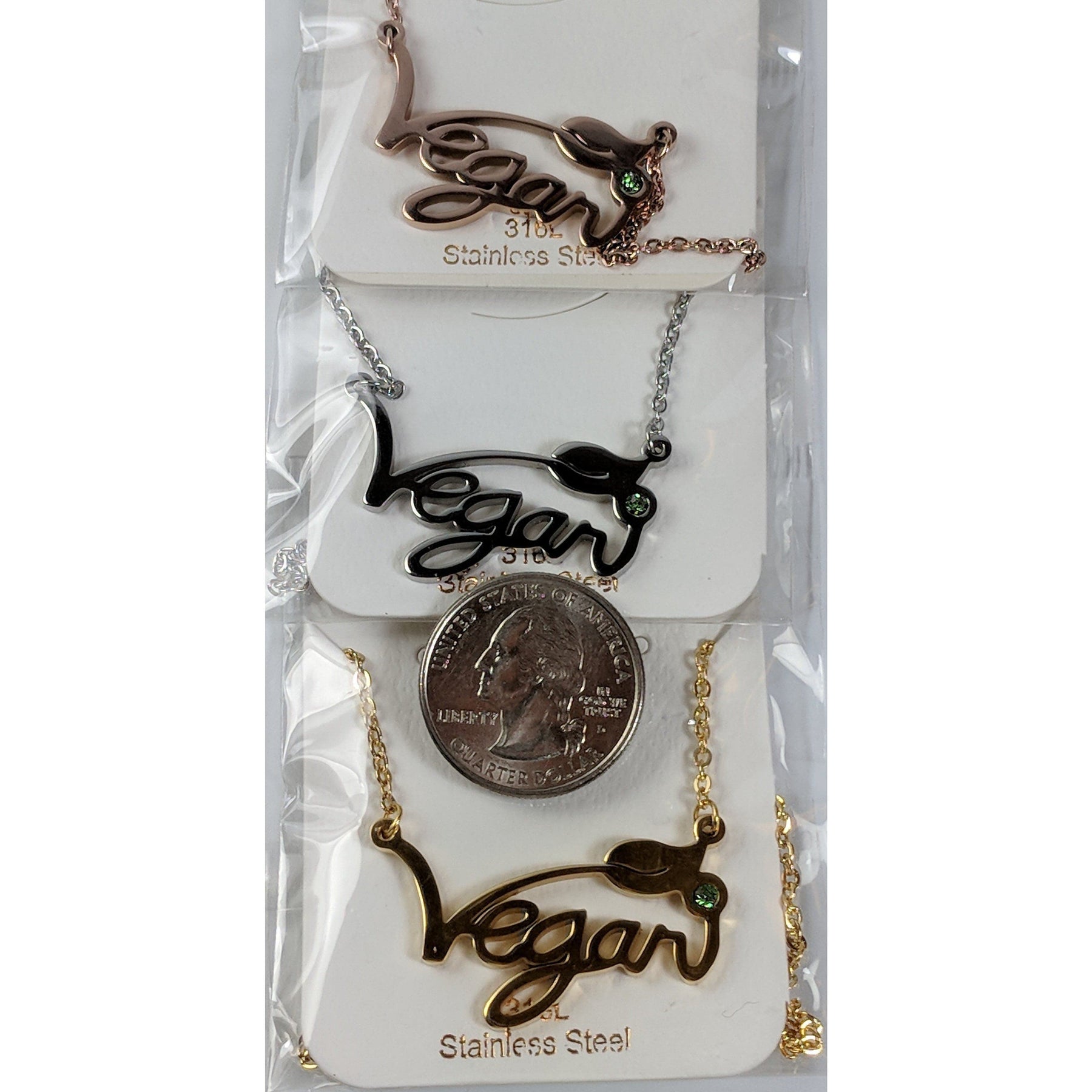 Vegan Stainless Steel Necklaces!  These beautiful necklaces and ring with the message of compassion on them are polished stainless steel to last for a lifetime of use! They are rose, gold and silver toned and are the perfect gift for the vegans in your life (and you! )   The ring is stainless steel colored with gunmetal gray.