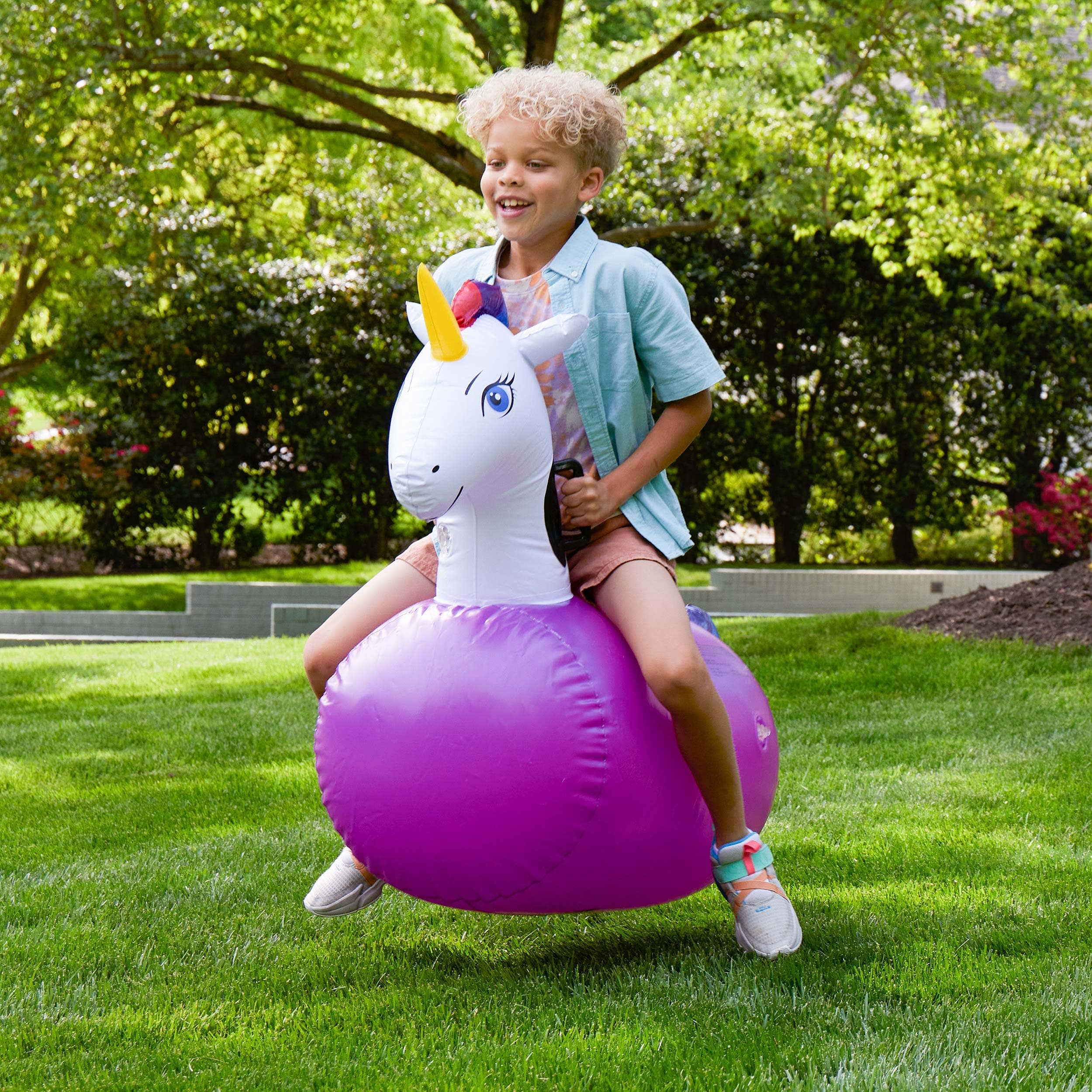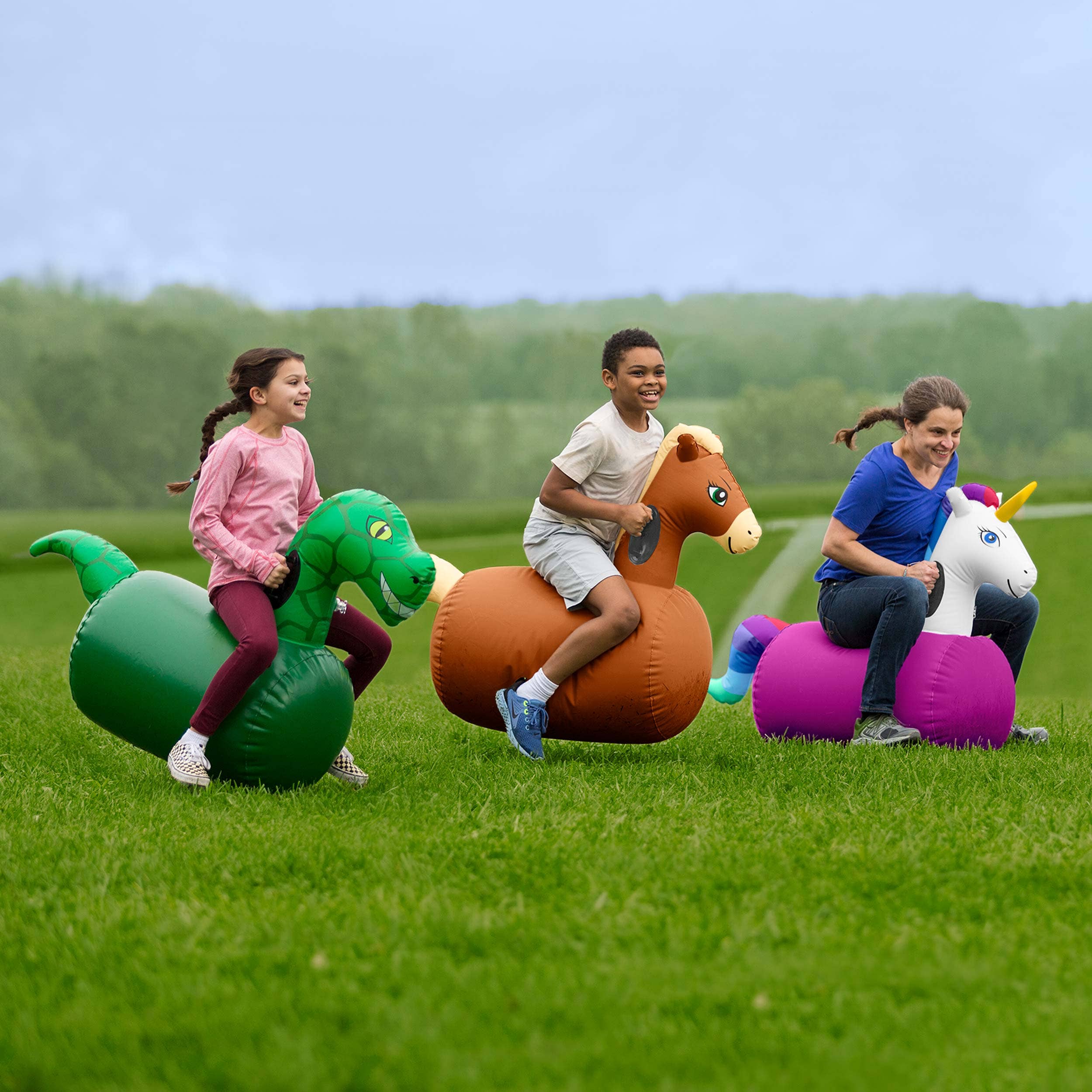 Bounce into adventure with these vibrant inflatable ride-on animals! Built from durable, heavy-duty vinyl, they're designed for active kids who love imaginative outdoor fun. The sturdy construction features ergonomic handles and a weighted base to keep riders secure and stable. At 48"L x 20"W x 36"H, they support up to 200 lbs, making them perfect for multiple children to take turns. Challenge friends to hop races, create obstacle courses, or simply enjoy hours of energetic play. Recommended for ages 5 and up. Quick inflation with a pump (sold separately) gets the fun started in minutes.