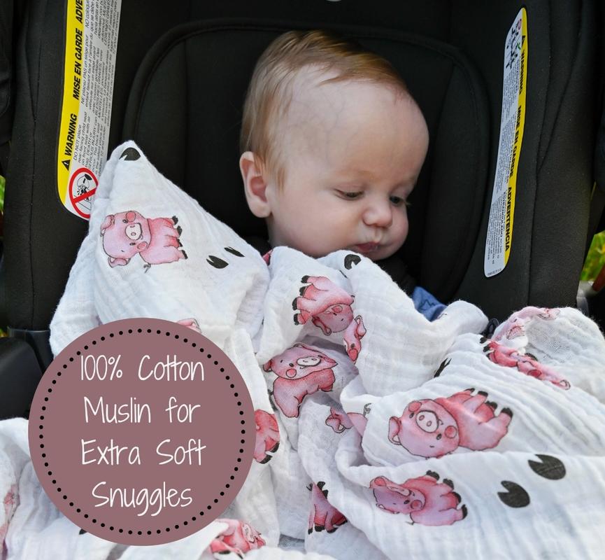 A beautiful, high-quality set of muslin swaddle blankets for the farm-themed nursery! Adorable pink pig, cute cow and fun tractor and barn three-piece set. A terrific baby shower gift that will be treasured and ALL proceeds help real farm animals...